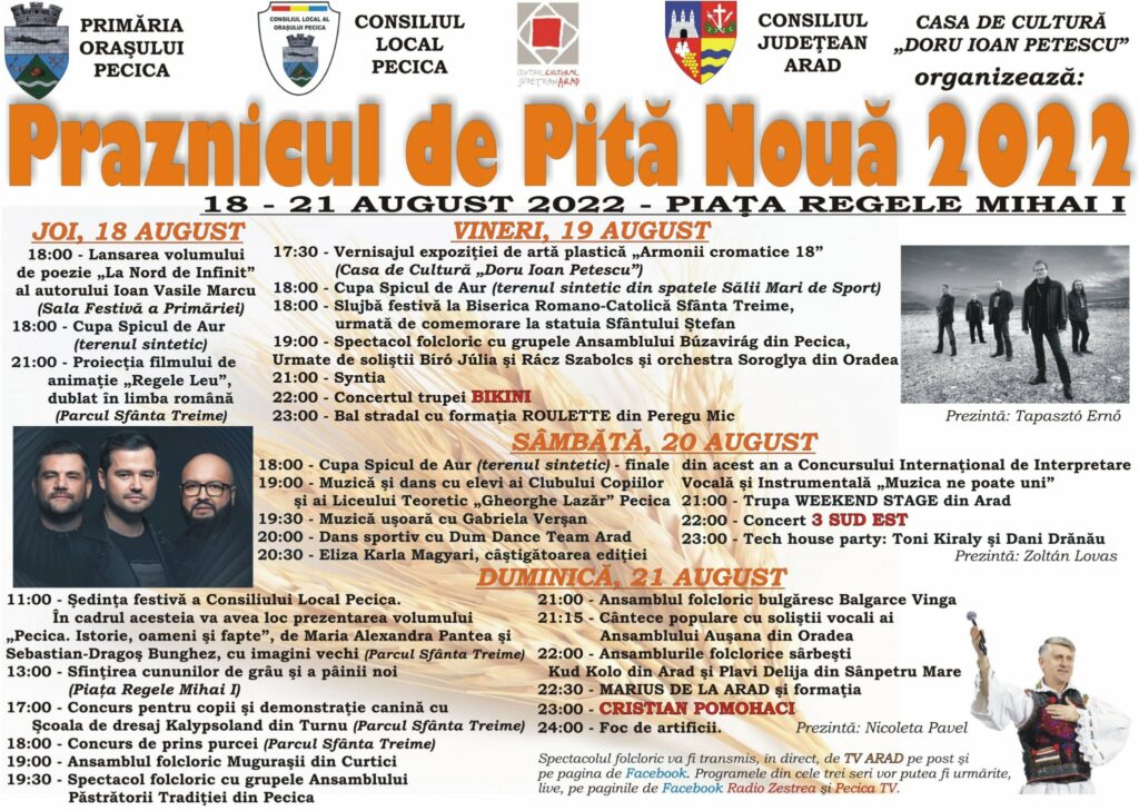 Continuăm tradiția şi ne bucurăm de recolta din acest an printr-o sărbătoare a întregii comunităţi. Începând de joia viitoare, până duminică noaptea, celebrăm Praznicul de Pită Nouă, cea mai cunoscută sărbătoare a noastră.Am pregătit un şir de programe dedicate tuturor generaţiilor şi aşteptăm pecicanii, tornenii, sederhătenii şi bodroganii, precum şi toţi cei care vor să fie alături de noi!