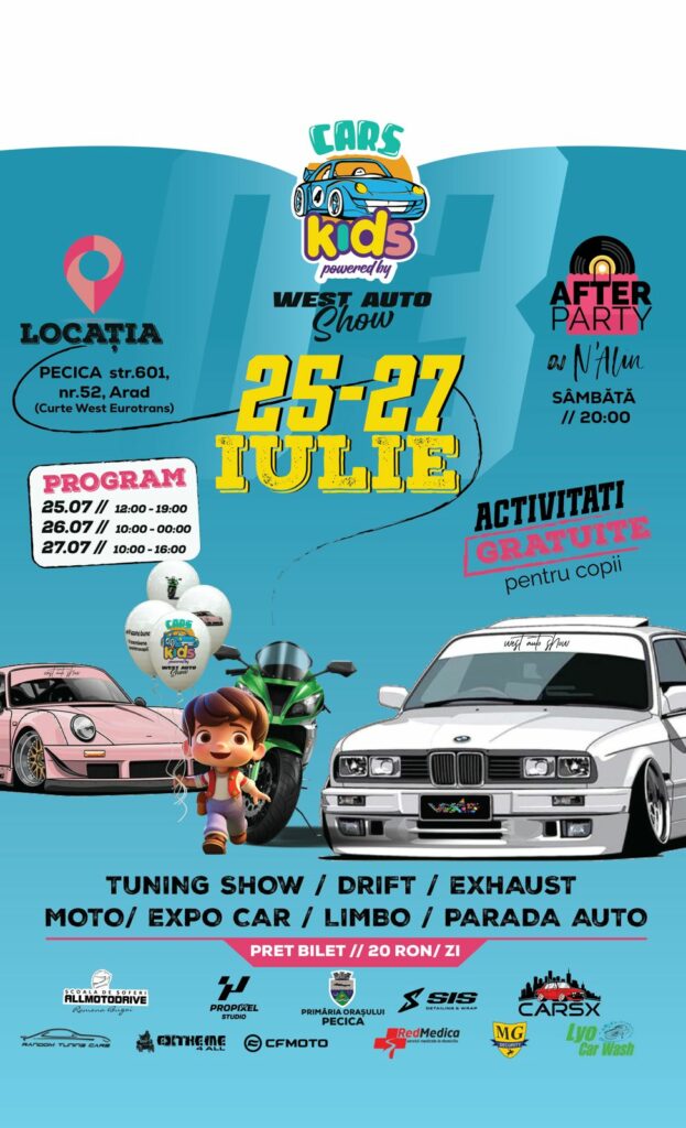 Petits et grands sont attendus en fin de semaine à l’événement Cars Kids, organisé par West Auto Show Pecica. L’événement propose de nombreuses activités autour de l’automobile : tuning, drift, échappement, moto, exposition automobile, limbo et défilé, ainsi qu’une série d’activités interactives et éducatives gratuites pour les enfants. Le public est attendu le vendredi de 12h à 19h, le samedi de 10h à 24h et le dimanche de 10h à 16h, dans la cour de West Eurotrans, à l’entrée de Pecica depuis Arad. Le billet d’entrée coûte 20 lei par jour.