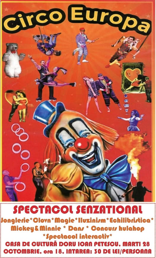 Petits et grands sont conviés à un spectacle interactif et joyeux, présenté par Circo Europa. Au programme : clowns, magie, jonglerie et danse. Le spectacle aura lieu le mardi à partir de 18 h au Centre culturel Doru Ioan Petescu. L’entrée coûte 30 lei par personne.