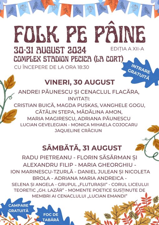You are here: Home › Știri din Pecica › Folk pe Pâine Folk pe Pâine În acest an tradiționalul festival Folk pe Pâine se va organiza la Pecica în perioada 30-31 august. Programul: Lasă un răspuns Anulează răspunsulAdresa ta de email nu va fi publicată. Câmpurile obligatorii sunt marcate cu *Comentariu Nume * Email * Site web Salvează-mi numele, emailul și site-ul web în acest navigator pentru data viitoare când o să comentez.