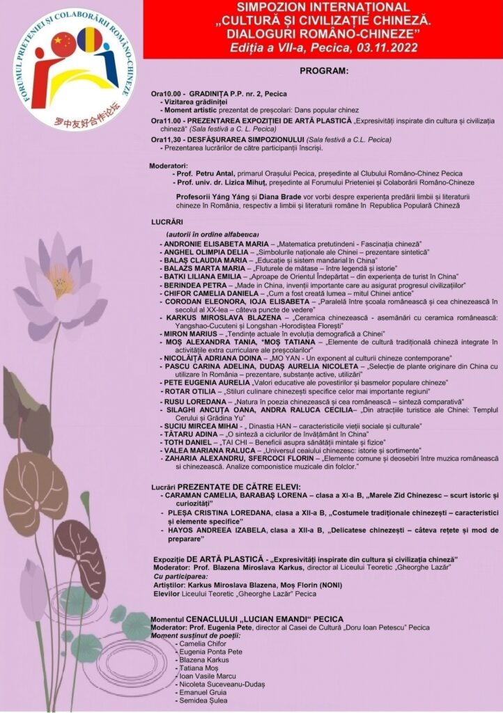 Le Forum d'amitié et de collaboration roumano-chinois, avec la mairie de Pecica et le conseil local de Pecica, le Pecica Pro-China Club et le lycée théorique "Gheorghe Lazăr" Pecica, vous invitent à la septième édition du Symposium international "Chinois Culture et Civilisation. Dialogues roumano-chinois". L'événement aura lieu demain, le 3 novembre, et est précédé d'une visite des invités à la maternelle à programme étendu no. 2. L'ouverture du symposium et de l'exposition d'art plastique qui lui est consacrée aura lieu à 11 heures, dans la salle des fêtes de la mairie de Pecica, puis il y aura la présentation des travaux préparés par les enseignants et les élèves du lycée de Pecica. L'événement réunira de hauts diplomates de l'ambassade de la République populaire de Chine en Roumanie. Le programme: