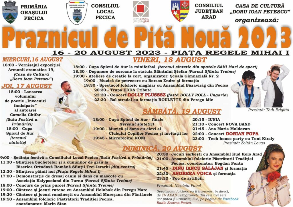 You are here: Home › Știri din Pecica › Praznicul de Pită Nouă Praznicul de Pită Nouă Tradiționalul Praznic de Pită Nouă se va desfășura în perioada 16-20 august. Programul: Lasă un răspuns Anulează răspunsulAdresa ta de email nu va fi publicată. Câmpurile obligatorii sunt marcate cu *Comentariu Nume * Email * Site web Salvează-mi numele, emailul și site-ul web în acest navigator pentru data viitoare când o să comentez.