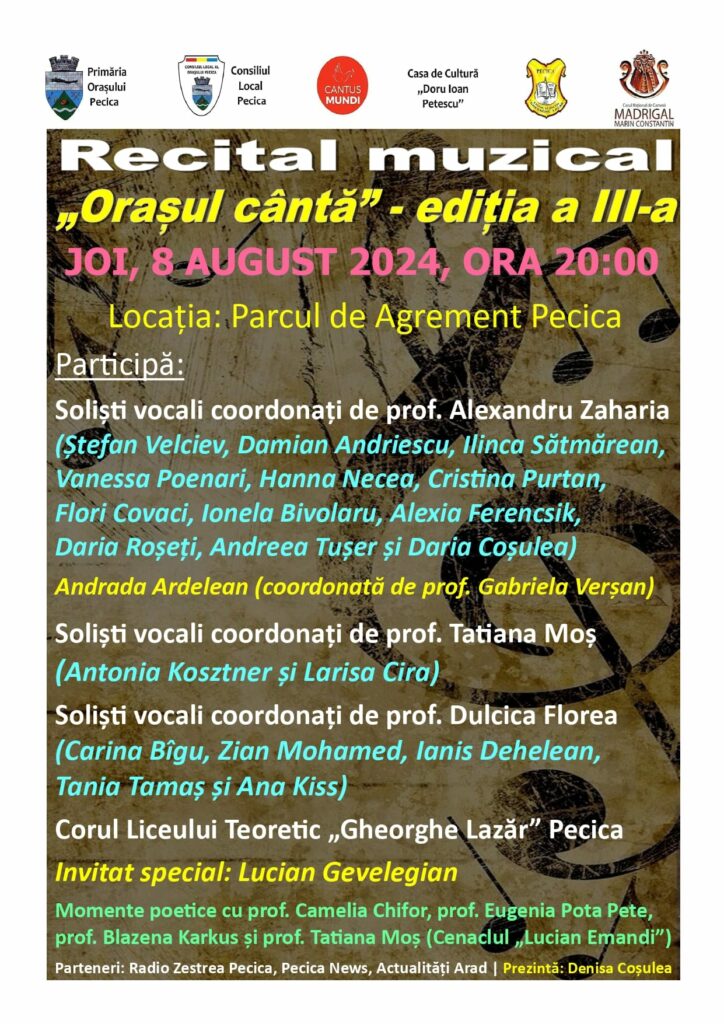 You are here: Home › Știri din Pecica › Recital muzical Recital muzical Joi, 8 august 2024, de la ora 20.00, în Parcul de Agrement din Pecica, va avea loc a III-a ediție a recitalului muzical „Orașul cântă”. Programul: Lasă un răspuns Anulează răspunsulAdresa ta de email nu va fi publicată. Câmpurile obligatorii sunt marcate cu *Comentariu Nume * Email * Site web Salvează-mi numele, emailul și site-ul web în acest navigator pentru data viitoare când o să comentez.
