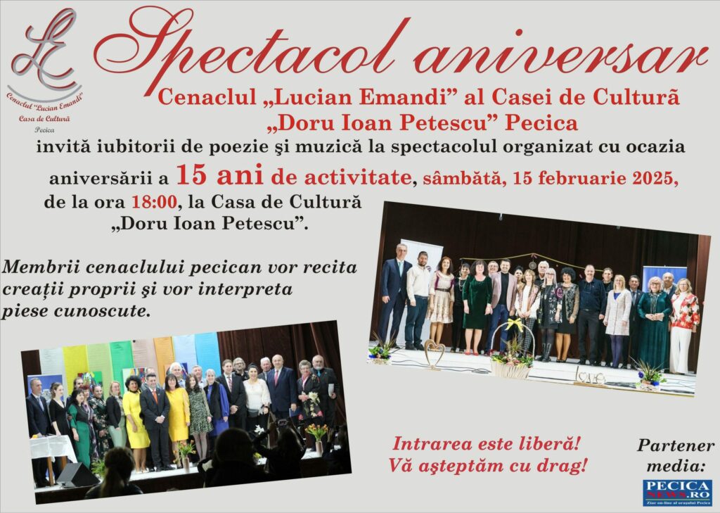 Spectacolul aniversar, cu poezie și muzică, va avea loc sâmbătă, 15 februarie, la ora 18.00, la Casa de Cultură Doru Ioan Petescu.