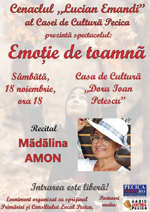 Publicul pecican este invitat sâmbătă, 18 noiembrie după-masă, la ultimul spectacol de poezie și muzică folk al anului, începând cu ora 18.00 .Programul liric se organizează cu sprijinul administrației locale, intrarea fiind liberă.